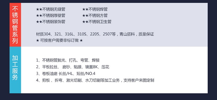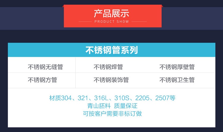 贊譽(yù)公司主要生產(chǎn)以201、202、304和316材質(zhì)為主的不銹鋼品用,機(jī)械構(gòu)造用,建筑裝飾用不銹鋼焊管,同時(shí)也可按照客戶要求定做:310、430 、409等各種材質(zhì)。
